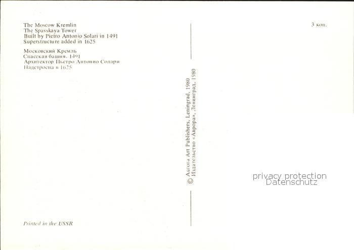 Moscow Moskva Kremlin Spasskaya Tower postalisch nicht gelaufen Erhaltung siehe scans [NatalD47]