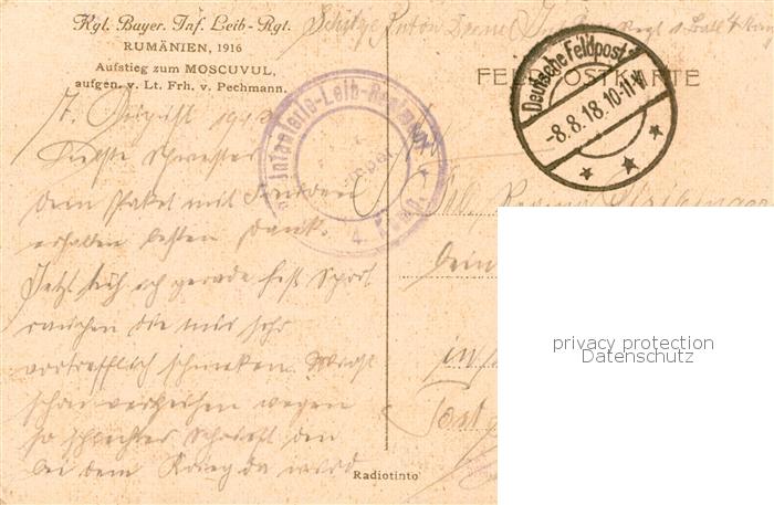 73803553 Moscuvul RO Kgl Bayer Inf Leib Rgt beim Aufstieg postalisch gelaufen Feldpost – Stempel Erhaltung siehe scans [FriedD77] Feldpost – Stempel old postcard Frie Katcode 11430