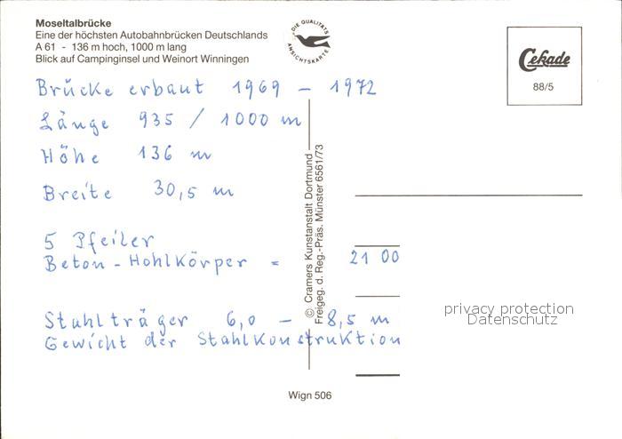 72207569 Mosel Region Moseltalbruecke Campinginsel Winningen Fliegeraufnahme postalisch nicht gelaufen Erhaltung siehe scans KatCode: 11110007111000