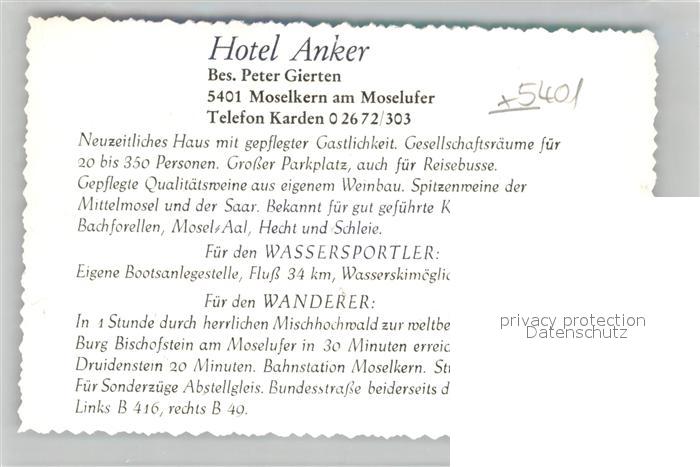 42975807 Moselkern Gasthof Anker Pitt Gastraum fuer Betriebsausfluege postalisch nicht gelaufen Werbekarte (keine Postkarte) Erhaltung siehe scans [KathaD81] KatCode: 11110007135065