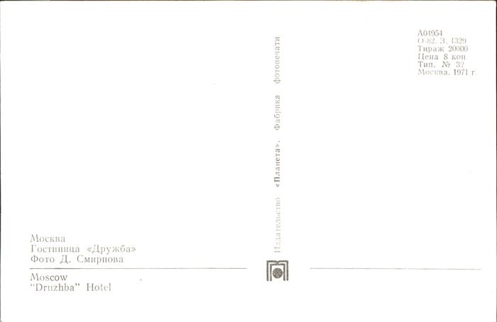 Moskau Moscou Druzhba Hotel postalisch nicht gelaufen Erhaltung siehe scans