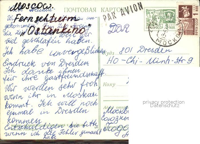 old postcard Moskau Moscou Fernsehturm Ostankino postalisch gelaufen Erhaltung siehe scans