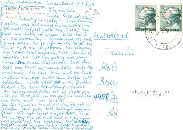 13049472 Moso Sesto Pension Sonnenhof postalisch gelaufen Erhaltung siehe scans [NatalD47] old postcard Nata Katcode 11240