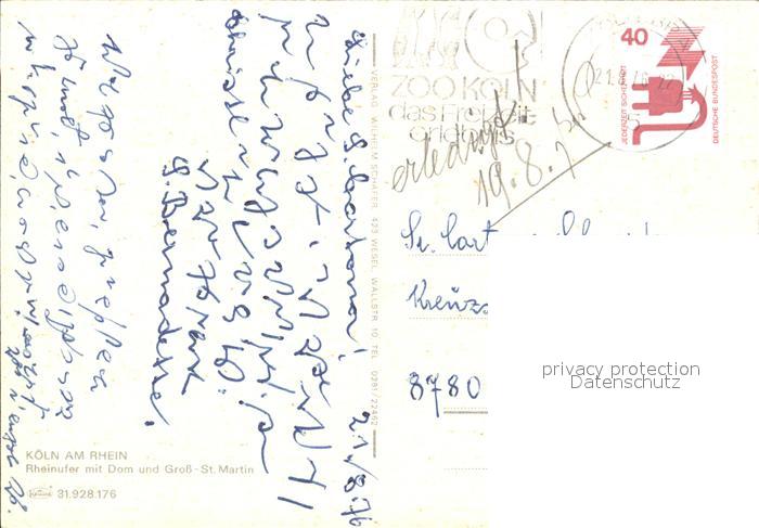 alte Postkarte Motorschiffe Koeln Rheinufer Dom Gross-St. Martin postalisch gelaufen Erhaltung siehe scans