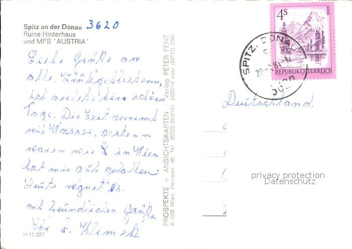alte Postkarte Motorschiffe MFS Austria Spitz an der Donau Ruine Hinterhaus postalisch gelaufen Erhaltung siehe scans