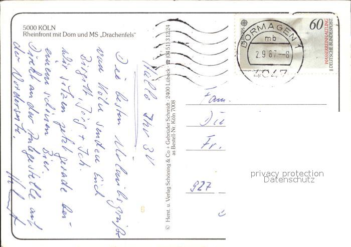 alte Postkarte Motorschiffe MS Drachenfels Koeln Rheinfront Dom postalisch gelaufen Erhaltung siehe scans