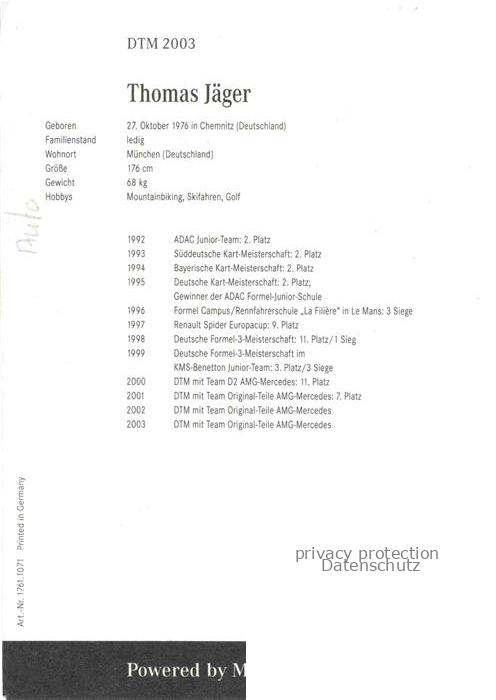 74052117 Motorsport Racing Thomas Jaeger DTM Mercedes Benz Autogramm postalisch nicht gelaufen Erhaltung siehe scans [IrynaD87] KatCode: 22520000001600