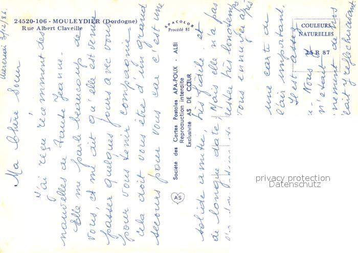 13580757 Mouleydier Rue Albert Claveille postalisch nicht gelaufen Erhaltung siehe scans [FriedD77] KatCode: 11170024124296