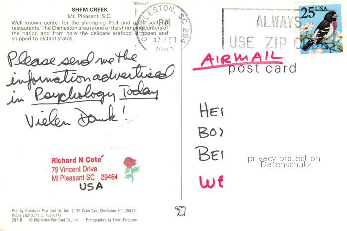 72926201 old postcard Mount Pleasant South Carolina Shem Creek Harbour Fishing Boats postalisch gelaufen Erhaltung siehe scans [FriedD77] KatCode: 14140430000000
