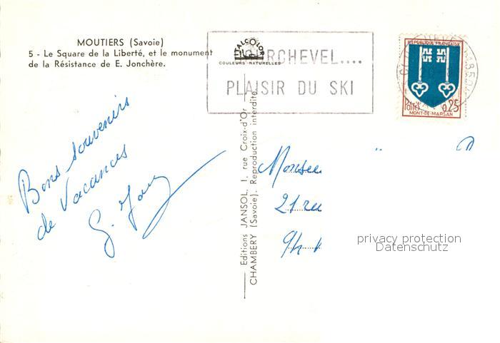 13590141 Moutiers d Albertville Le Square de la Liberte et le monument de la Resistance de E Jonchere postalisch gelaufen Erhaltung siehe scans [WerneD78] carte postale Wern Katcode 11170073173181