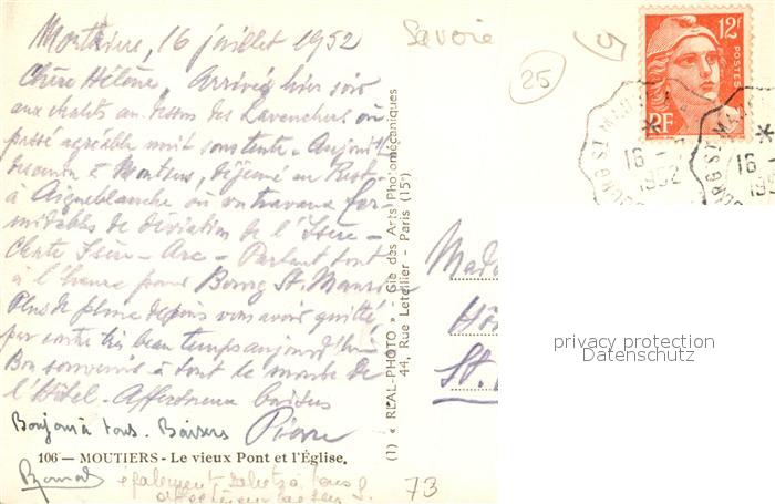 13486802 carte postale Moutiers d Albertville Vieux Pont Eglise postalisch gelaufen Erhaltung siehe scans [FriedD77] KatCode: 11170073173181