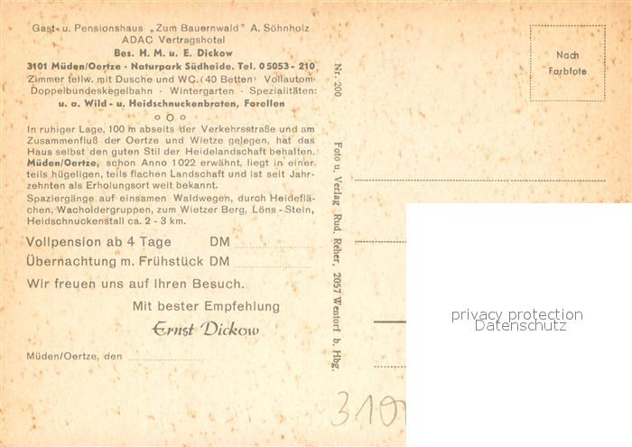 73663657 Mueden oertze Gast- und Pensionshaus Zum Bauernwald Naturpark Suedheide Hermann Loens Stein Denkmal Zusammenfluss der Oertze und Wietze postalisch nicht gelaufen Erhaltung siehe scans [FriedD77] KatCode: 11110003351010