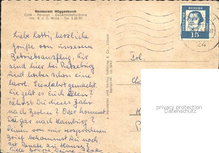 alte Postkarte Mueggenbusch Restaurant Cafe Pension Gartenterrasse Springbrunnen Teich postalisch gelaufen Erhaltung siehe scans