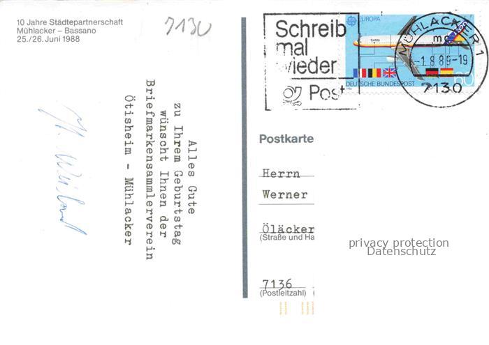 74054274 alte Postkarte Muehlacker 10 Jahre Staedtepartnerschaft Muehlacker – Bassano postalisch gelaufen Erhaltung siehe scans [FriedD77] KatCode: 11110008236040