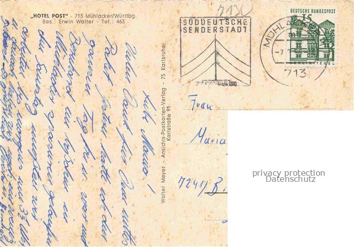 74059188 alte Postkarte Muehlacker Blick zum Sender Burgruine Loeffelstetz Hotel Post Gastraum postalisch gelaufen Erhaltung siehe scans [WerneD78] KatCode: 11110008236040