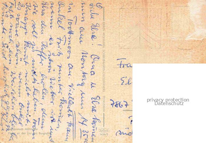 74054732 alte Postkarte Muehlacker Partie an der Enz Burgruine postalisch gelaufen Erhaltung siehe scans [FriedD77] KatCode: 11110008236040