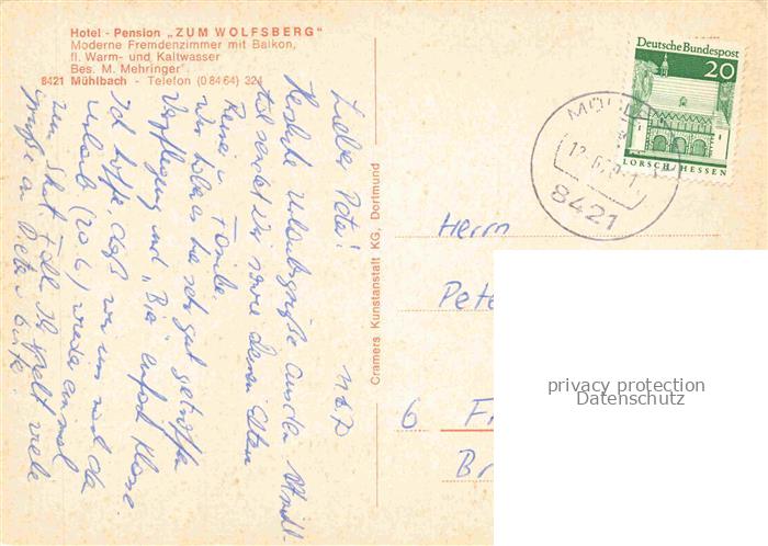 74049298 alte Postkarte Muehlbach Altmuehltal Hotel Pension zum Wolfsberg postalisch gelaufen Erhaltung siehe scans [FriedD77] KatCode: 11110009273164