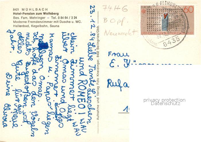 73667095 alte Postkarte Muehlbach Altmuehltal Hotel Pension zum Wolfsberg postalisch gelaufen Erhaltung siehe scans [WerneD78] KatCode: 11110009273164