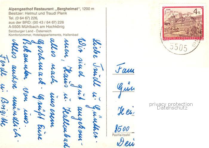 73158686 alte Postkarte Muehlbach Hochkoenig Alpengasthof Bergheimat postalisch gelaufen Erhaltung siehe scans [WerneD78] KatCode: 11390322050415