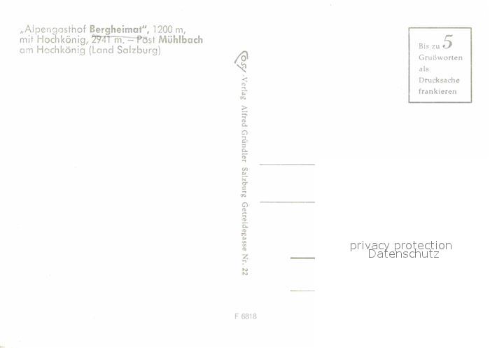 72666057 Muehlbach Hochkoenig Alpengasthof Bergheimat postalisch nicht gelaufen Erhaltung siehe scans [WerneD78] KatCode: 11390322050415