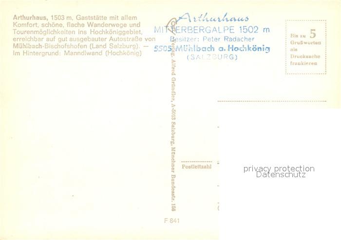 13235960 Muehlbach Hochkoenig Arthurhaus Berggaststaette Mitterbergalpe Mandlwand postalisch nicht gelaufen Erhaltung siehe scans [FriedD77] KatCode: 11390322050415