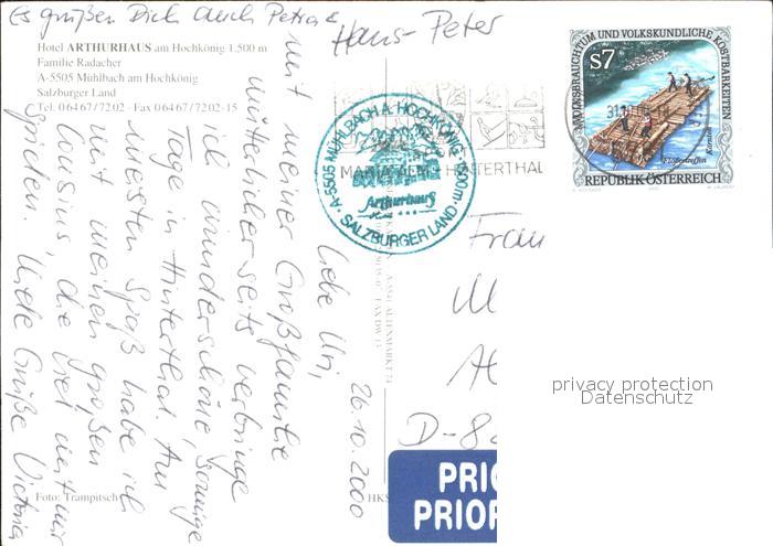 72296893 alte Postkarte Muehlbach Hochkoenig Hotel Arthurhaus Edelweiss Berchtesgadener Alpen postalisch gelaufen Erhaltung siehe scans KatCode: 11390322050415