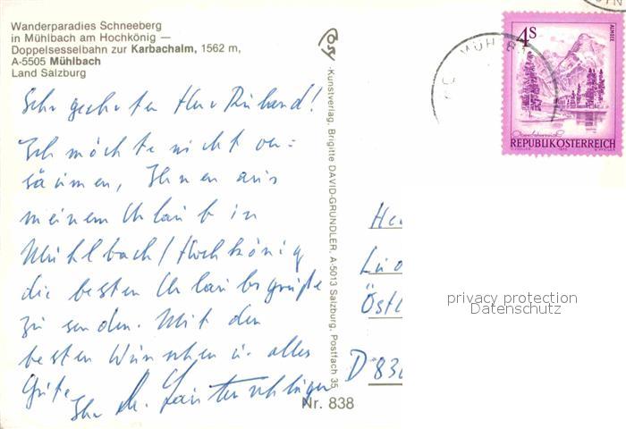 72619700 alte Postkarte Muehlbach Hochkoenig Karbachalm Wanderparadies Schneeberg postalisch gelaufen Erhaltung siehe scans [FriedD77] KatCode: 11390322050415