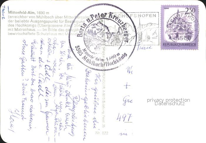 72288270 alte Postkarte Muehlbach Hochkoenig Mittenfeld- Alm postalisch gelaufen Erhaltung siehe scans KatCode: 11390322050415