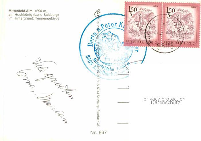 72862547 alte Postkarte Muehlbach Hochkoenig Mittenfeld Alm am Hochkoenig im Hintergrund Tennengebirge postalisch gelaufen Erhaltung siehe scans [FriedD77] KatCode: 11390322050415