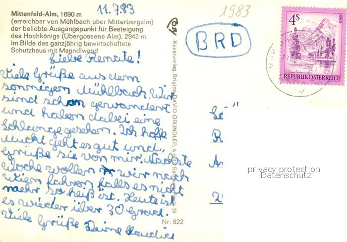 73063045 alte Postkarte Muehlbach Hochkoenig Mittenfeld Alm Schutzhaus postalisch gelaufen Erhaltung siehe scans [FriedD77] KatCode: 11390322050415