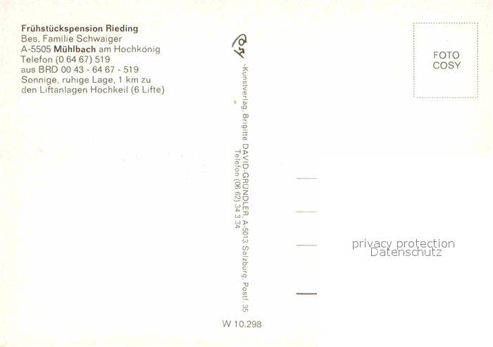 72902826 Muehlbach Hochkoenig Pension Rieding postalisch nicht gelaufen Erhaltung siehe scans [AndreD76] KatCode: 11390322050415