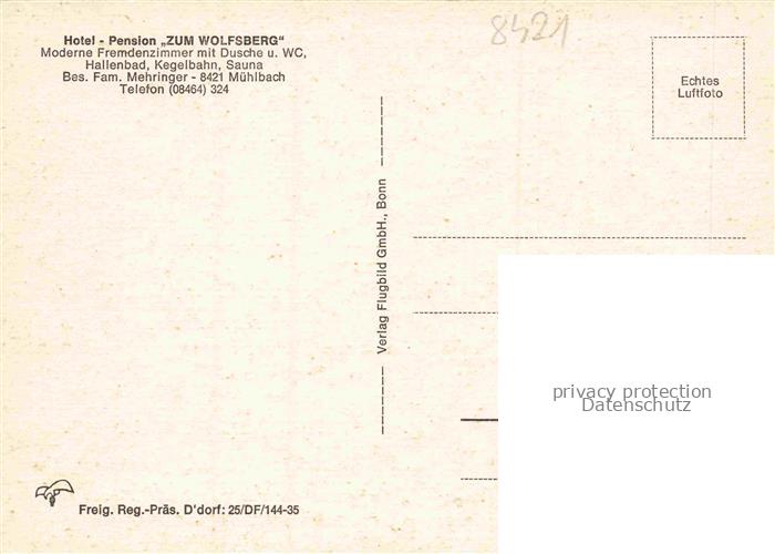 74035427 Muehlbach Oberpfalz Hotel Pension Zum Wolfsberg Fliegeraufnahme postalisch nicht gelaufen Erhaltung siehe scans [WerneD78] KatCode: 11110009373121