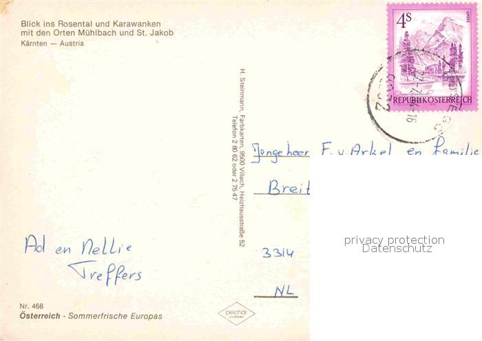 72823298 alte Postkarte Muehlbach Rosental Panorama Rosental mit Muehlbach und St Jakob Karawanken Fliegeraufnahme postalisch gelaufen Erhaltung siehe scans [FriedD77] KatCode: 11390211020722