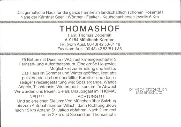 72447105 Muehlbach Rosental Thomashof Hotel Restaurant Swimming Pool Alpenblick postalisch nicht gelaufen Werbekarte (keine Postkarte) Erhaltung siehe scans KatCode: 11390211020722