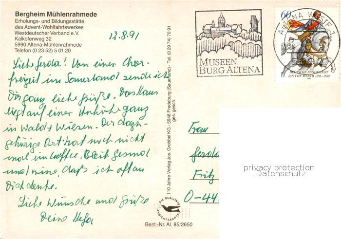 73687247 alte Postkarte Muehlenrahmede Bergheim Muehlenrahmede Erholungs- und Bildungsstaette postalisch gelaufen Erhaltung siehe scans [FriedD77] KatCode: 11110005962004