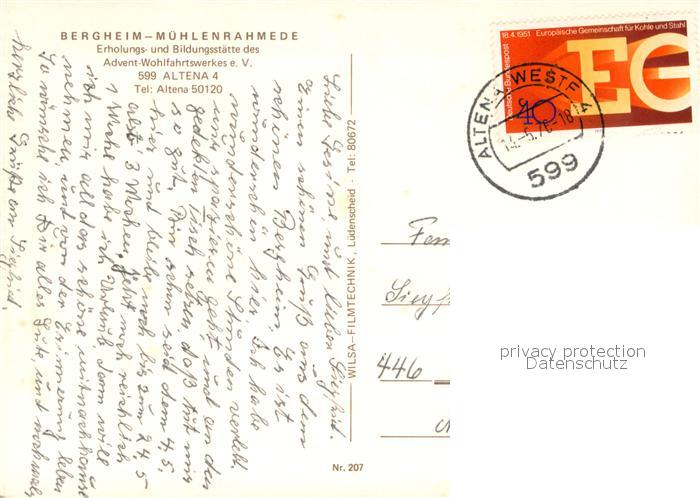 73684953 alte Postkarte Muehlenrahmede Erholungs- und Bildungsstaette des Advent-Wohlfahrtswerkes e.V. Landschaftspanorama postalisch gelaufen Erhaltung siehe scans [FriedD77] KatCode: 11110005962004