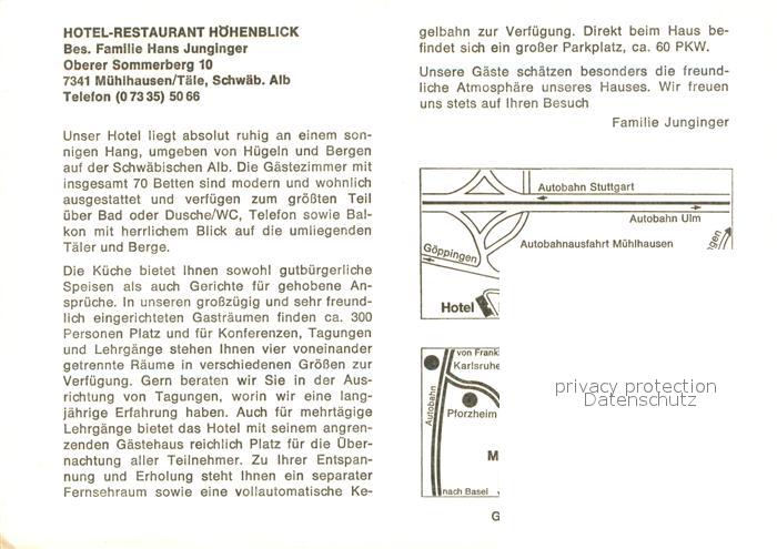 73643495 Muehlhausen Taele Hotel Restaurant Hoehenblick Gastraeume postalisch nicht gelaufen Werbekarte (keine Postkarte) Erhaltung siehe scans [WerneD78] KatCode: 11110008117035