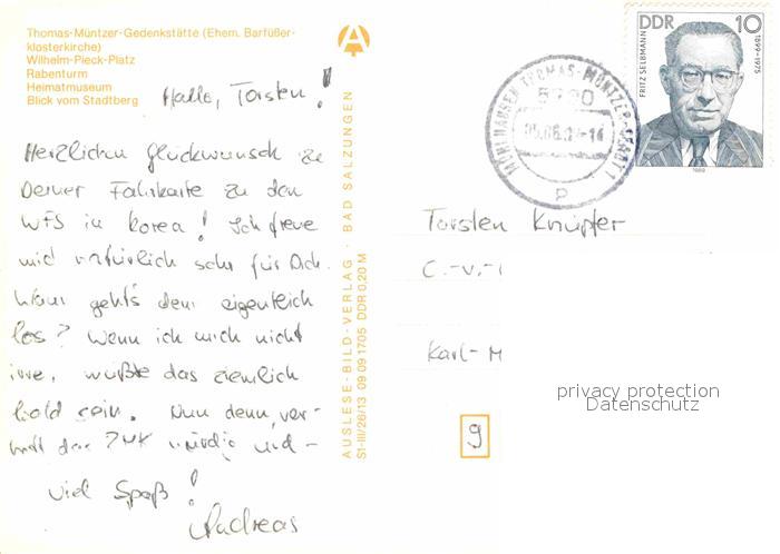 72651943 alte Postkarte Muehlhausen Thueringen Barfuesser Klosterkirche Wilh Pieck Platz Rabenturm Heimatmuseum Blick vom Stadtberg postalisch gelaufen Erhaltung siehe scans [WerneD78] KatCode: 11110016064046