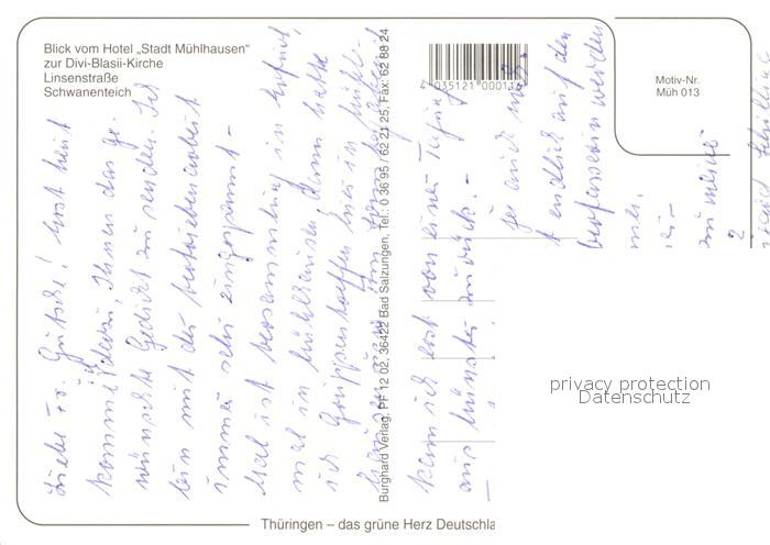 73145006 Muehlhausen Thueringen Blick vom Hotel Stadt Muehlhausen Divi Blasii Kirche Linsenstrasse Fachwerkhaeuser Schwanenteich postalisch nicht gelaufen Erhaltung siehe scans [FriedD77] KatCode: 11110016064046