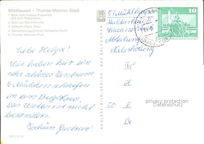 72374233 alte Postkarte Muehlhausen Thueringen Frauentor Marienkirche Wilhelm Pieck Platz Naherholungszentrum Schwanenteich Thomas Muentzer Park Gaststaette postalisch gelaufen Erhaltung siehe scans KatCode: 11110016064046