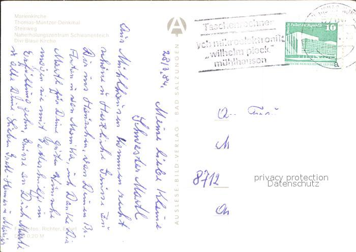 72372485 alte Postkarte Muehlhausen Thueringen Marienkirche Thomas Muentzer-Denkmal Steinweg postalisch gelaufen Erhaltung siehe scans KatCode: 11110016064046