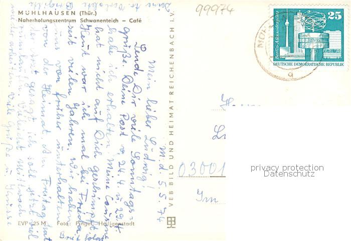 73865628 alte Postkarte Muehlhausen Thueringen Naherholungszentrum Schwanenteich Cafe postalisch gelaufen Erhaltung siehe scans [FriedD77] KatCode: 11110016064046