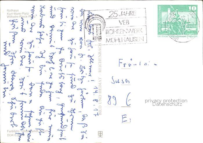 72323459 alte Postkarte Muehlhausen Thueringen Rathaus Karl Marx Platz Wilhelm Pieck Platz Brunnen postalisch gelaufen Erhaltung siehe scans KatCode: 11110016064046