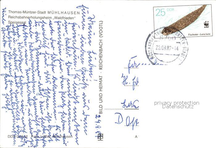 72135293 alte Postkarte Muehlhausen Thueringen Speisesaal Reichsbahnerholungsheim Waldfrieden Thomas Muentzer Stadt postalisch gelaufen Erhaltung siehe scans KatCode: 11110016064046