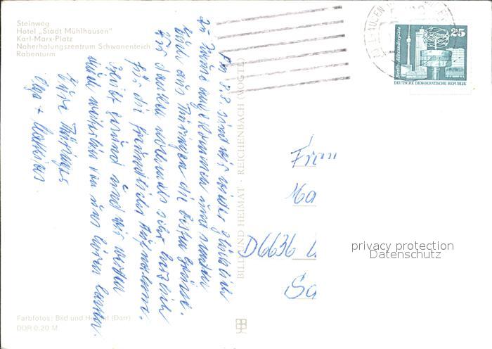 72280732 alte Postkarte Muehlhausen Thueringen Steinweg Hotel Stadt Muehlhausen Karl Marx Platz Naherholungszentrum Schwanenteich Rabenturm Thomas Muentzer Stadt postalisch gelaufen Erhaltung siehe scans KatCode: 11110016064046