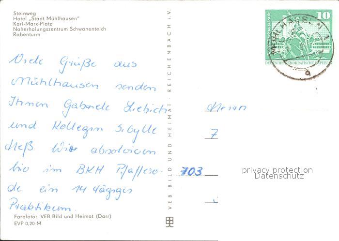 72023742 alte Postkarte Muehlhausen Thueringen Steinweg Hotel Stadt Muehlhausen Karl MarxPlatz Rabenturm postalisch gelaufen Erhaltung siehe scans KatCode: 11110016064046