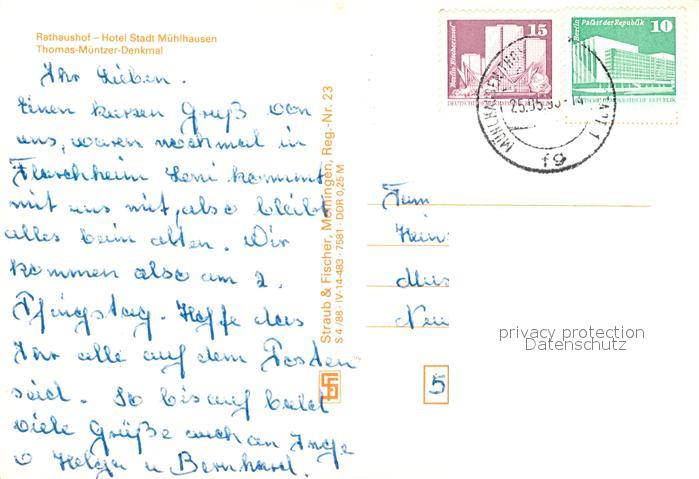 73248978 alte Postkarte Muehlhausen Thueringen Thomas Muentzer Stadt Rathaushof Hotel Stadt Muehlhausen Thomas Muentzer Denkmal Statue postalisch gelaufen Erhaltung siehe scans [FriedD77] KatCode: 11110016064046