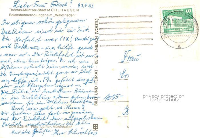 73335892 alte Postkarte Muehlhausen Thueringen Thomas Muentzer Stadt Reichsbahnerholungsheim Waldfrieden postalisch gelaufen Erhaltung siehe scans [FriedD77] KatCode: 11110016064046