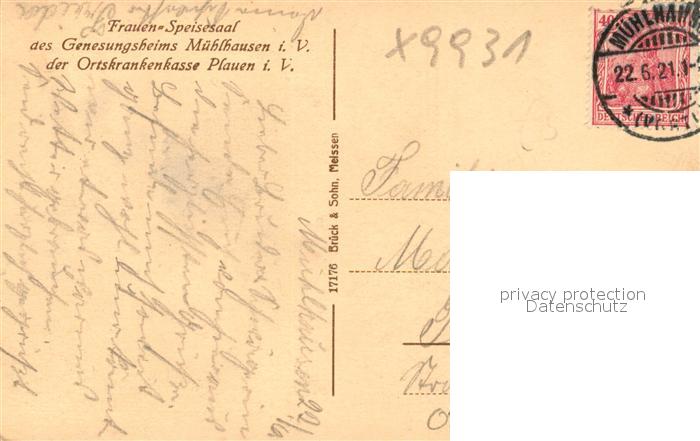 43056970 alte Postkarte Muehlhausen Vogtland Frauen Speisesaal Genesungsheim Ortskrankenkasse Plauen postalisch gelaufen Erhaltung siehe scans [KathaD81] KatCode: 11110014178050