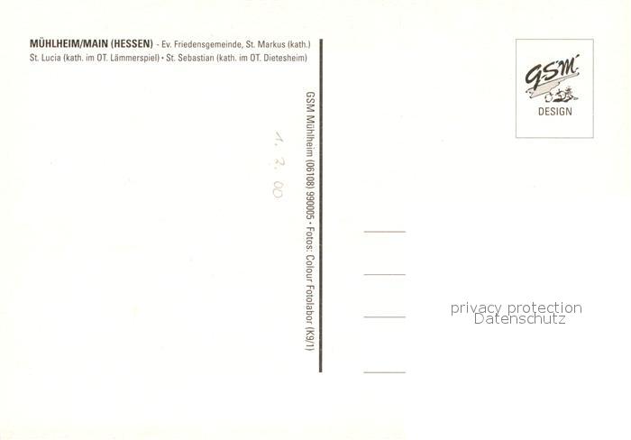 73246477 Muehlheim Main 1100 Jahre Muehlenstadt Ev Friedensgemeinde Kirchen St. Markus St Lucia St Sebastian postalisch nicht gelaufen Erhaltung siehe scans [FriedD77] KatCode: 11110006438008